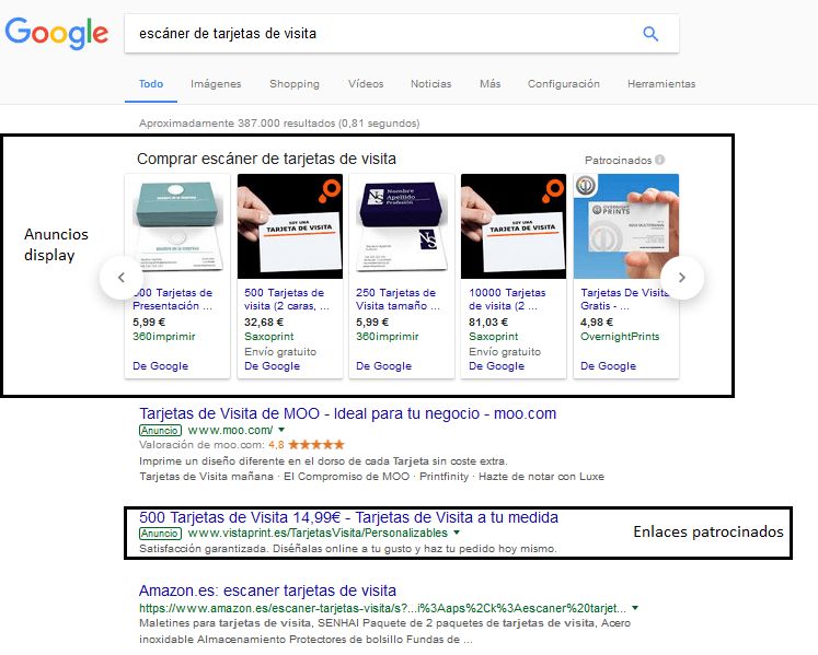 Si se hace una búsqueda en Google por ejemplo «escáner de tarjetas de visita» los resultados son, por un lado, la búsqueda orgánica y, por otro lado, las búsquedas pagadas que Google indica como tales y que se muestran arriba de todo o abajo de todo en los resultados de búsqueda.